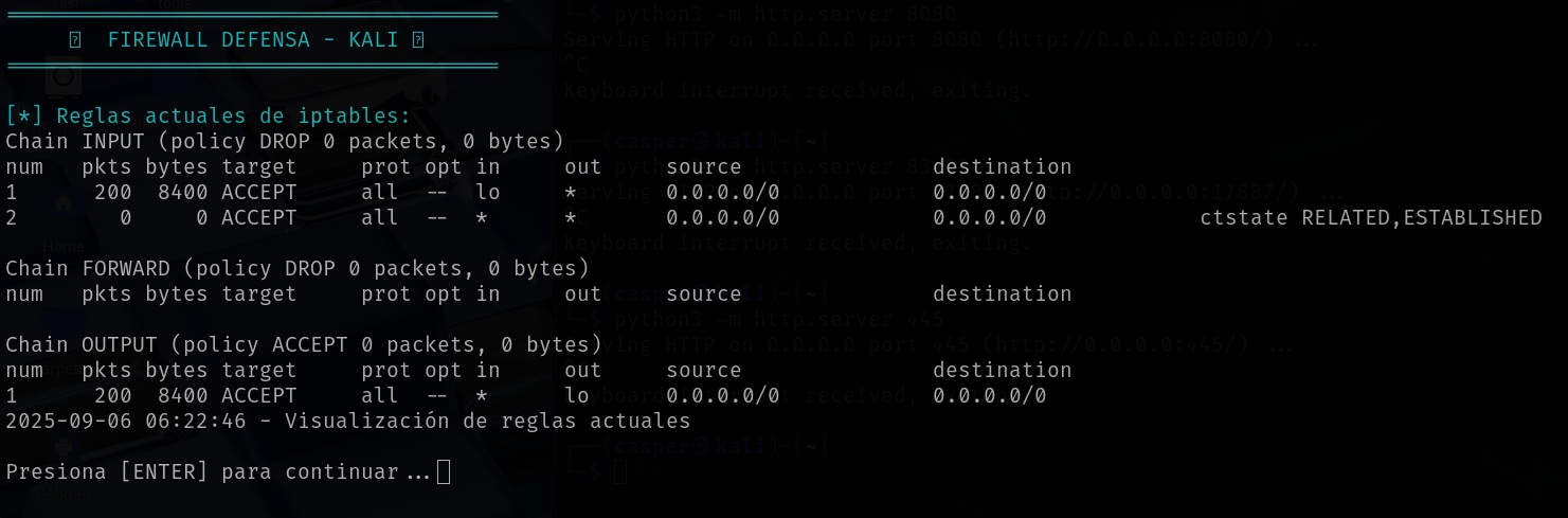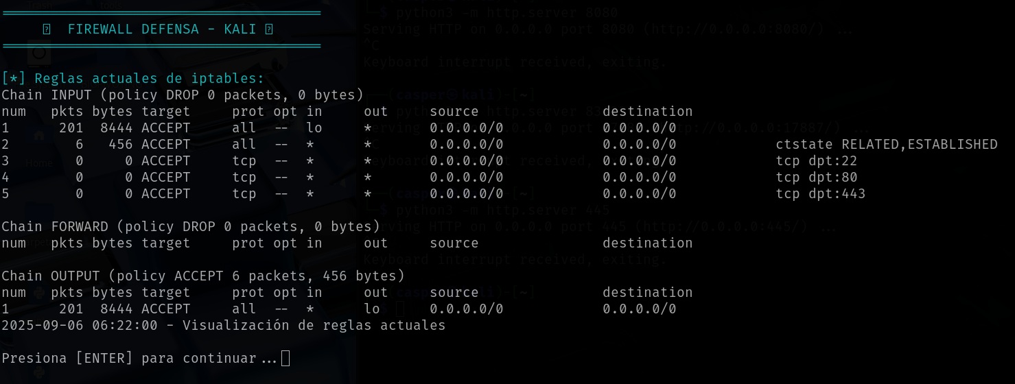 – Código en: https://github.com/C4sp3r2222/ AutoFirewall_DefensaKali